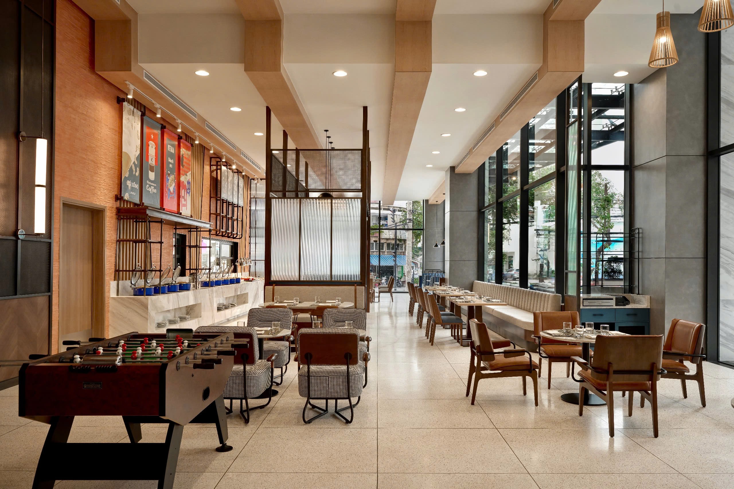 Không gian ẩm thực tại khách sạn mang tinh thần trẻ trung, gần gũi. The Mesh – nhà hàng phục vụ cả ngày – giới thiệu thực đơn đa dạng từ ẩm thực Việt Nam đến quốc tế, nổi bật với các món đặc sản địa phương. Trong khi đó, Riley’s Bar là điểm hẹn thư giãn với các loại cocktail và những dòng bia thủ công địa phương thuộc chương trình Best Brews®, dấu ấn đặc trưng của thương hiệu Four Points by Sheraton.