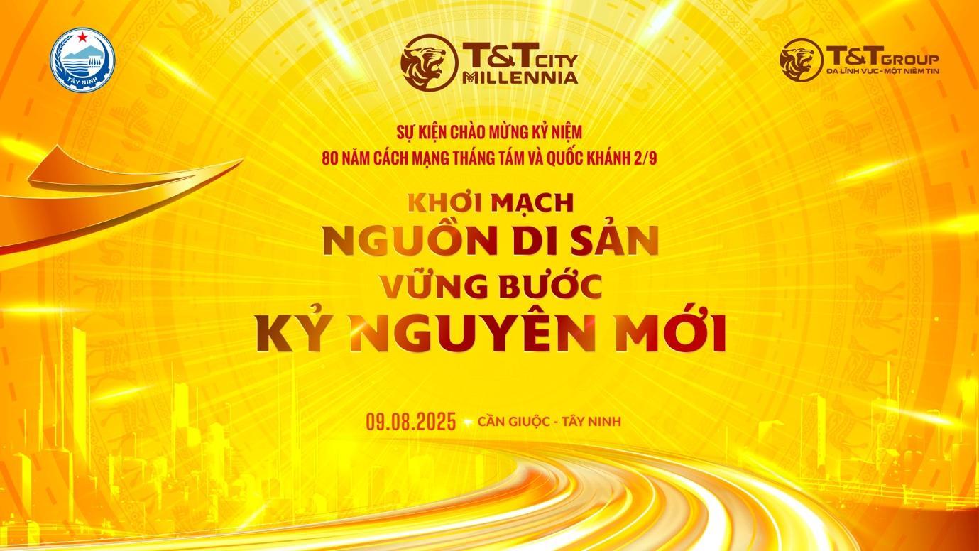 Ngày 9-8, tức cuối tuần này, đại nhạc hội với chủ đề "Khơi mạch nguồn Di sản - Vững bước kỷ nguyên mới" do T&T Group tổ chức sẽ chính thức diễn ra tại thành phố Thiên niên kỷ T&T City Millennia (xã Cần Giuộc, tỉnh Tây Ninh). Sự kiện nhằm chào mừng kỷ niệm 80 năm Cách mạng Tháng Tám và Quốc khánh 2-9.
